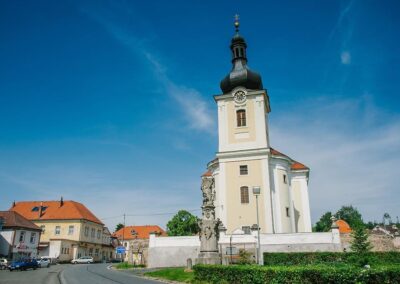 Najdete nás ve středu obce naproti kostela sv. Václava. K rozsáhlému romantickému opravenému zámku s parkem a velkým rybníkem je to od nás necelé 2 km.